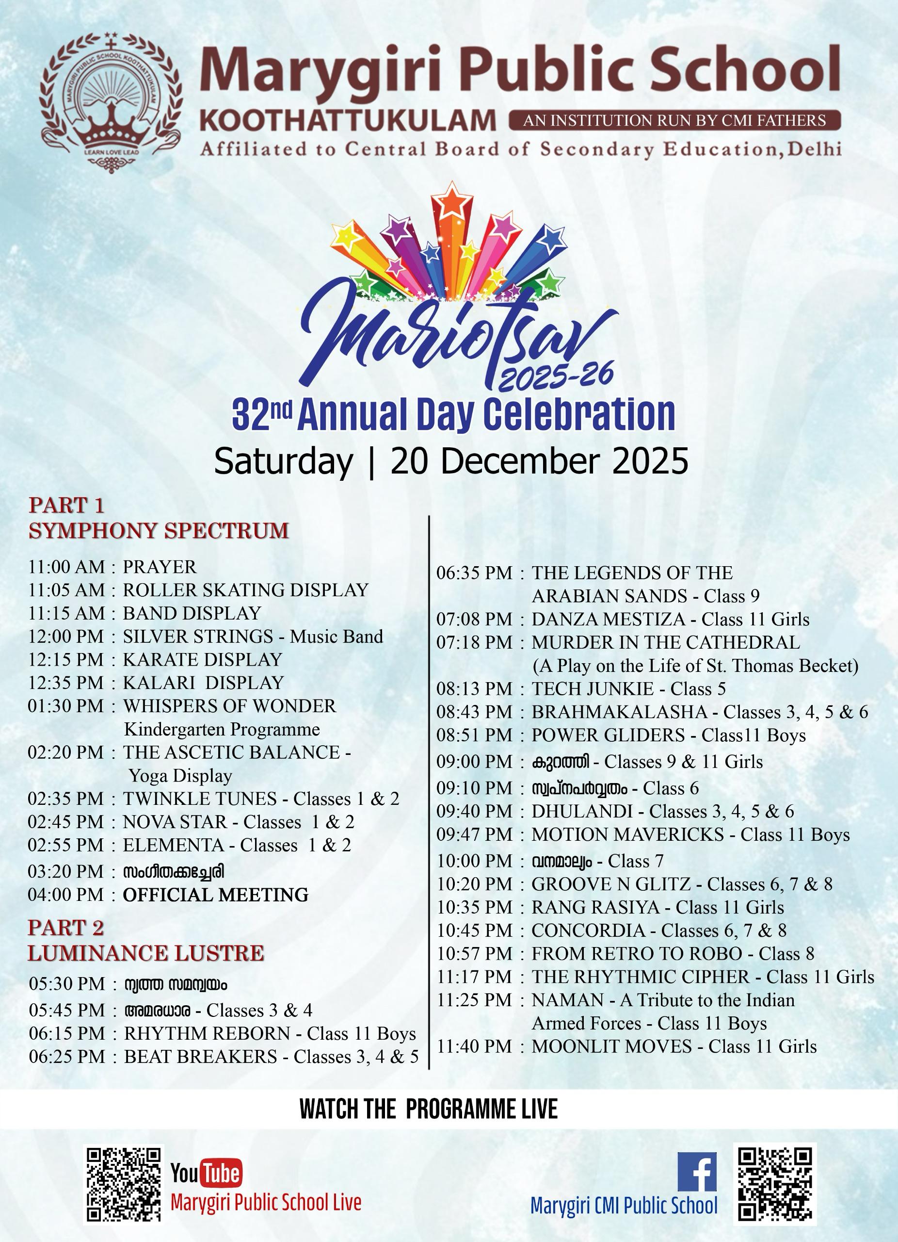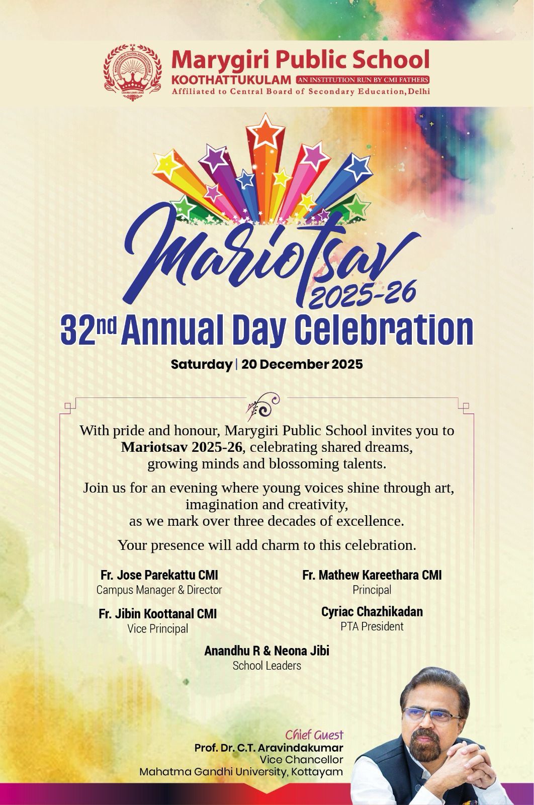 Year 2025–26 is solemnised as the “CMI Year of Education” and we celebrate the rich educational vision of the Carmelites of Mary Immaculate. “Integral Formation of Human Persons”, the motto of this special year urges us to look beyond textbooks and examinations. Saint Irenaeus profoundly said, “The glory of God is man fully alive.” At Marygiri, our mission is to help every student to become that “fully alive” individual, one who is intellectually bright, emotionally balanced, socially responsible and spiritually rooted.